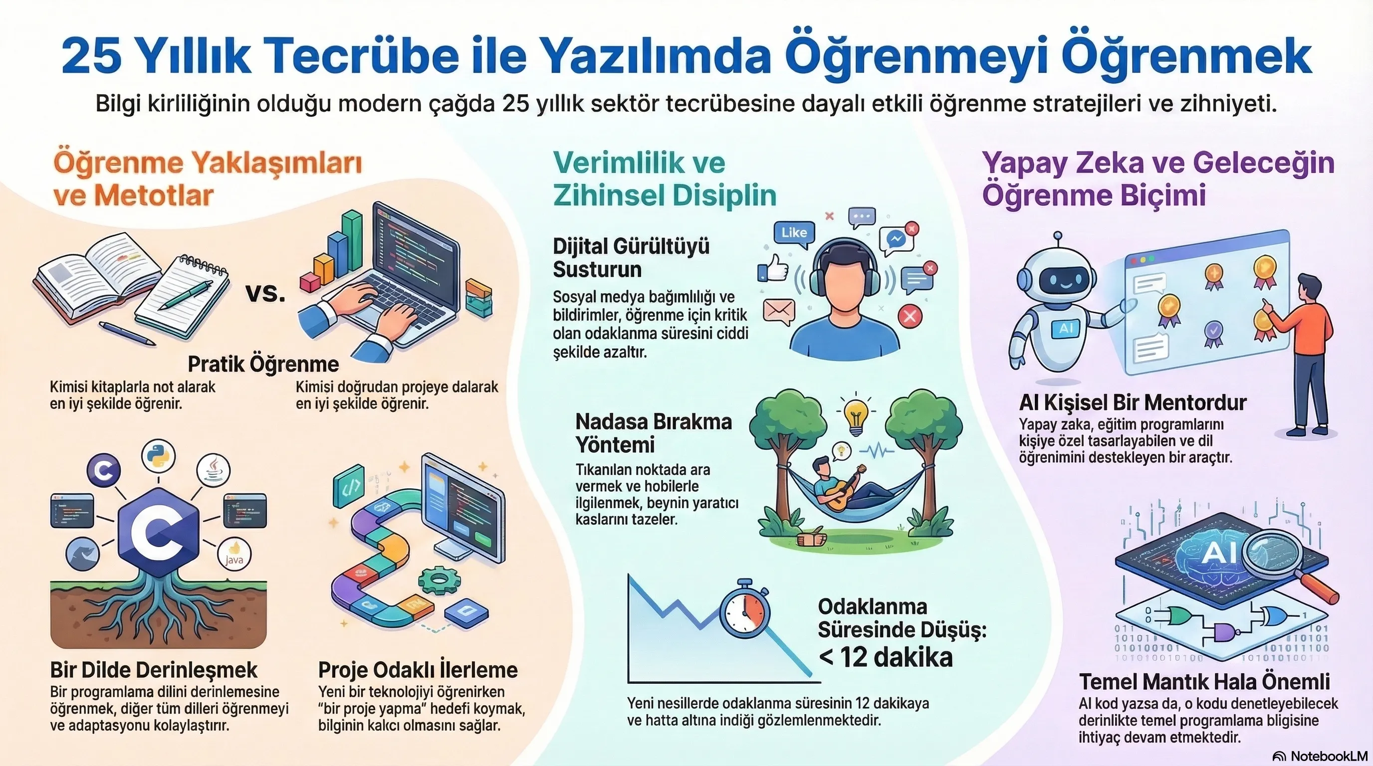 Çeyrek asıra yakın deneyimimizle öğrenmeyi nasıl öğrendiğimizi konuştuk. QBasic kitabı anılarından yapay zeka ile kişiselleştirilmiş öğrenmeye, bilgi kıtlığından bilgi zehirlenmesine, sosyal medya bağımlılığından “nadas” prensibine kadar geniş bir yelpazede pratik tavsiyeler paylaştık. Sonuç: Araçlar değişse de kalıcı olan tek şey merak duygusudur.