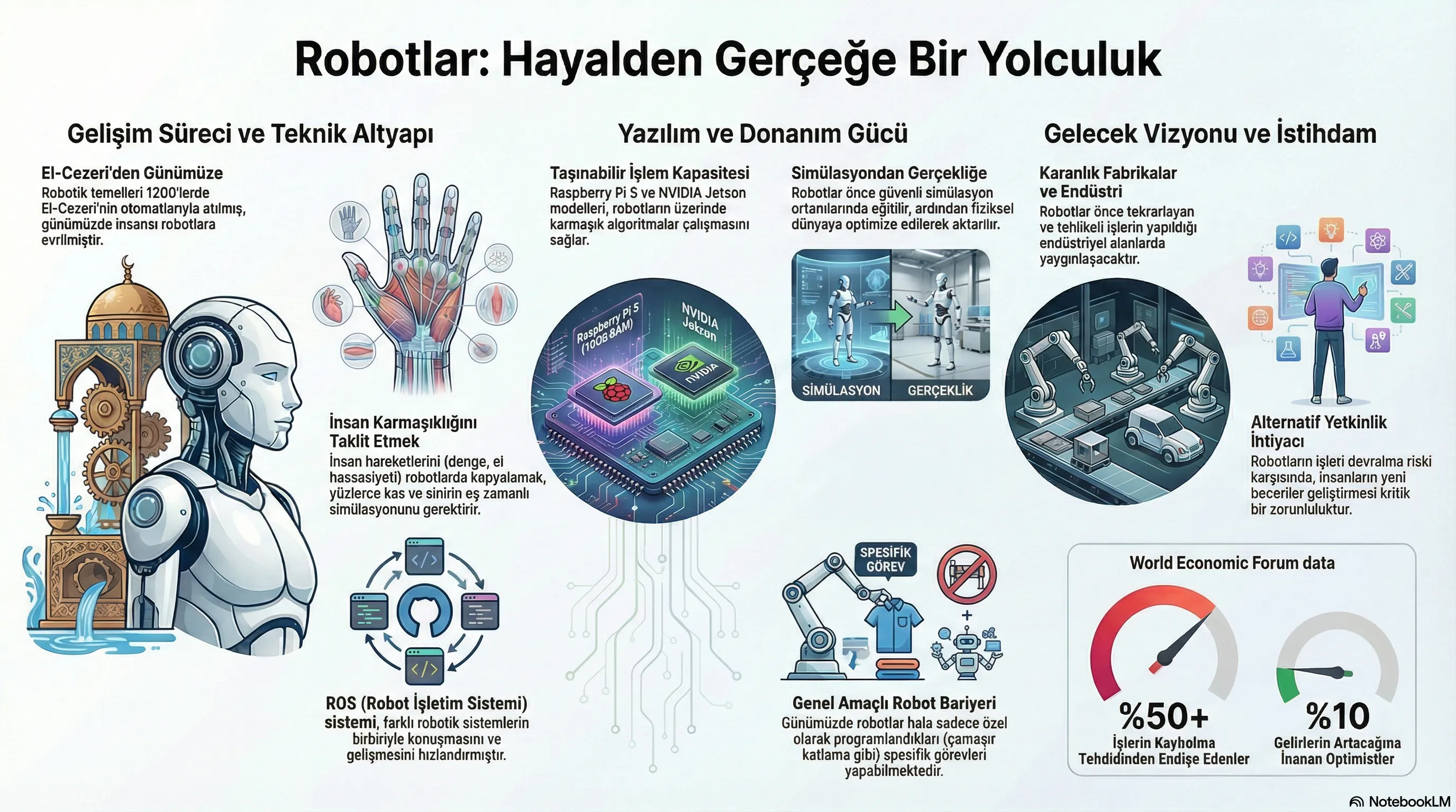 Robotik dünyasını çocukluk anılarımızdan bugünün mühendislik gerçeklerine kadar geniş bir perspektifle konuştuk. Voltron ve Transformers’ın hayallerinden El-Cezeri’nin 800 yıllık mirasına, Boston Dynamics’in bacaklı robotlarından karanlık fabrikalara… İnsan vücudunun muazzam karmaşıklığını taklit etmenin neden bu kadar zor olduğunu, ROS’un robotik dünyasındaki devrimini ve robotların gerçekten işimizi alıp almayacağını tartıştık.